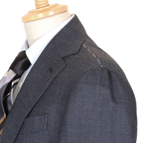 最高品質のウールカシミヤのバーズアイファブリックを使用しており、こちらの生地は光の当たり方や見る角度によって浅いネイビーにもグレーにも見える、中間色のスモークブルーカラーとなっております。ネイビースーツとグレースーツの際に普段されているスタイリングがどちらでもはまり、クラシカルでいてモダンな雰囲気を持つ汎用性の高いラグジュアリーな一着です。